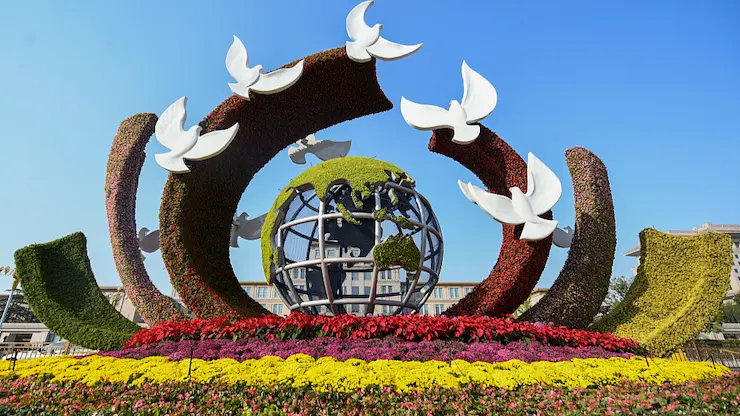 Instalación floral con palomas en Beijing. Fuente: https://espanol.cgtn.com/news/2023-02-22/1628213557968818177/index.html